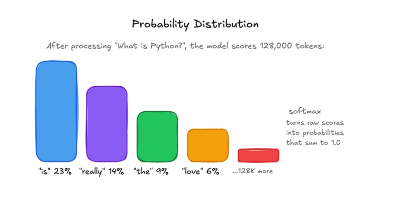 This is the core reality of the LLM generation. The model doesn’t decide what to say. It produces a probability distribution over all possible next tokens. Your final response is just one path through an enormous space of possibilities.