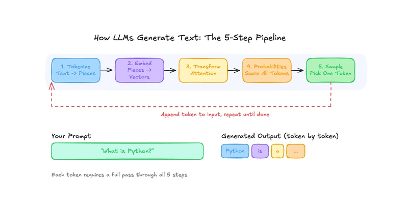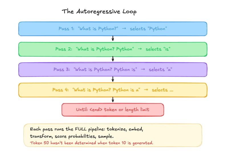Through a loop. Once one token is selected, it gets appended to the input, and the entire five-step pipeline runs again. Tokenize, embed, transform, compute probabilities, and sample. For every single token.