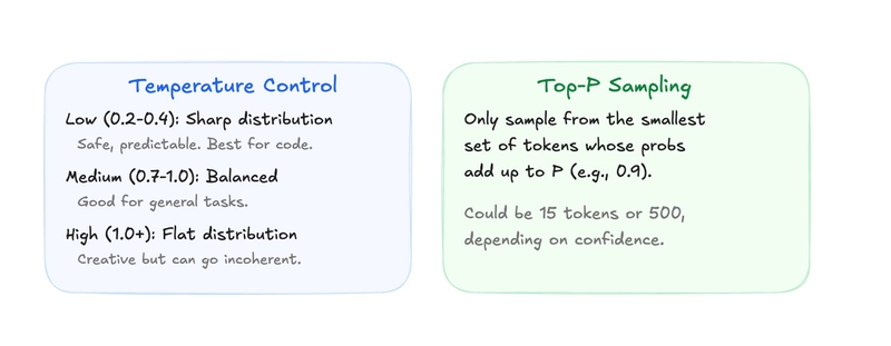 Top-p says: “only sample from the smallest set of tokens whose probabilities add up to p.” If top-p is 0.9, you might be choosing from just 15 tokens or 500, depending on how confident the model is about the current position.