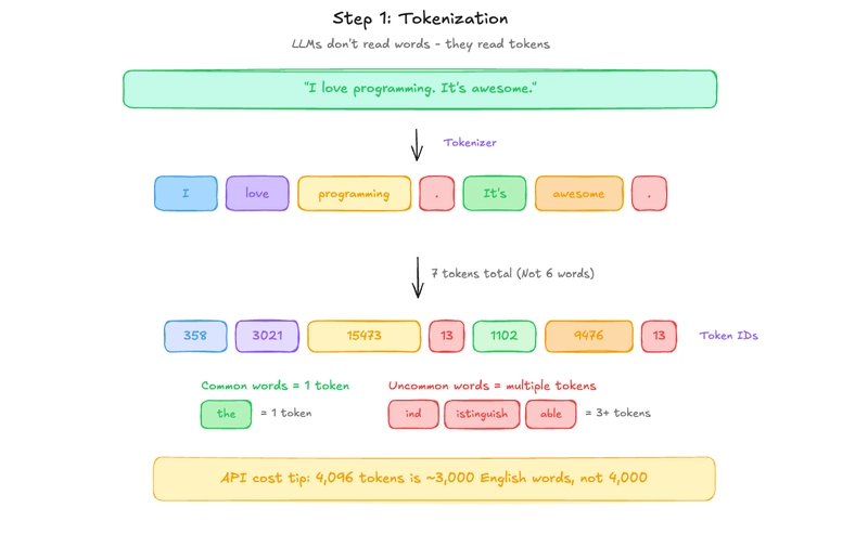 Why this matters to you as a developer: When an API says the maximum context is 4,096 tokens, that’s not 4,000 words. It can be roughly 3,000 words of English. Tokens are smaller units than words, and every token costs you money on API calls.