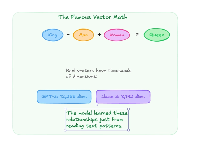 There’s a famous demonstration of how powerful these vectors are. If you take the vector for “king,” subtract the vector for “man,” and add the vector for “woman,” you land near “queen.” The model learned gender relationships purely from text patterns — nobody explicitly taught it.