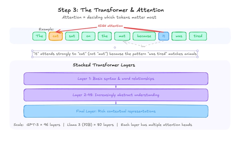 Even though “mat” is closer in the sentence, the model learned from patterns across millions of examples that “was tired” matches with animals, not objects.