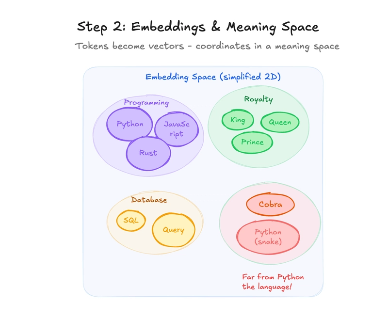 Think of it like this: words with similar meanings end up near each other in this space. “King” is near “queen.” “Python”, the programming language, is near “JavaScript.” But “Python” the snake is somewhere completely different.