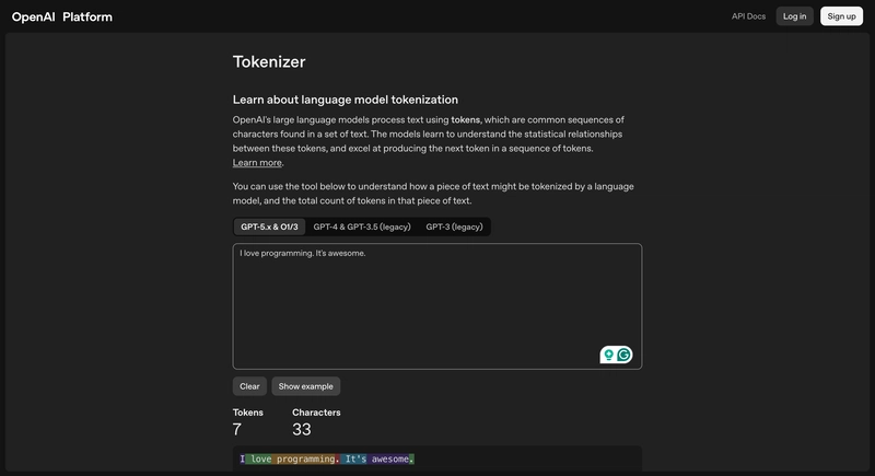 For example, if you type “I love programming. It’s awesome.” into OpenAI’s tokenizer, you get seven tokens. Most tokens correspond to whole words, but punctuation like the period gets its own separate token.